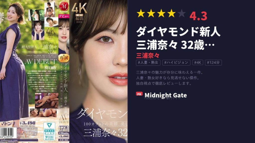 ※この記事にはアフィリエイトリンクが含まれています(PR) ダイヤモンド新人 三浦奈々 32歳 AV DEBUT 100カラットの美顔、美しく淫らに輝く― マドンナ手掛けの最高峰プレイメイト登場シリーズ「ダイヤモンド新人」。待望のAVデビュー作となる本作は、32歳... -